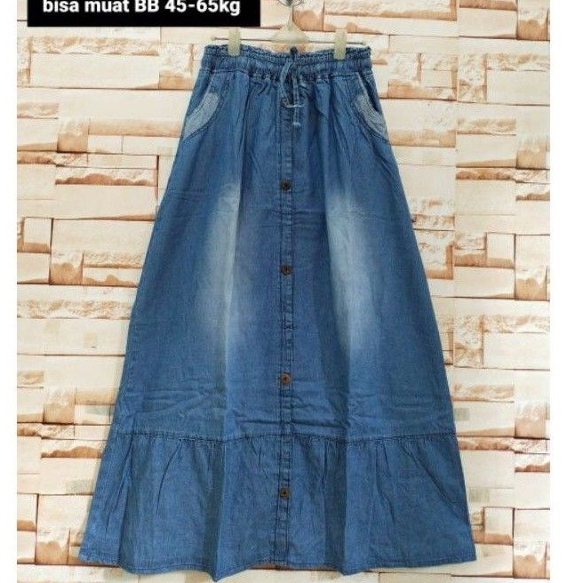 Rok jeans premium rempel dewasa kancing panjang/rok jeans pinggang karet bawah kerut dewasa